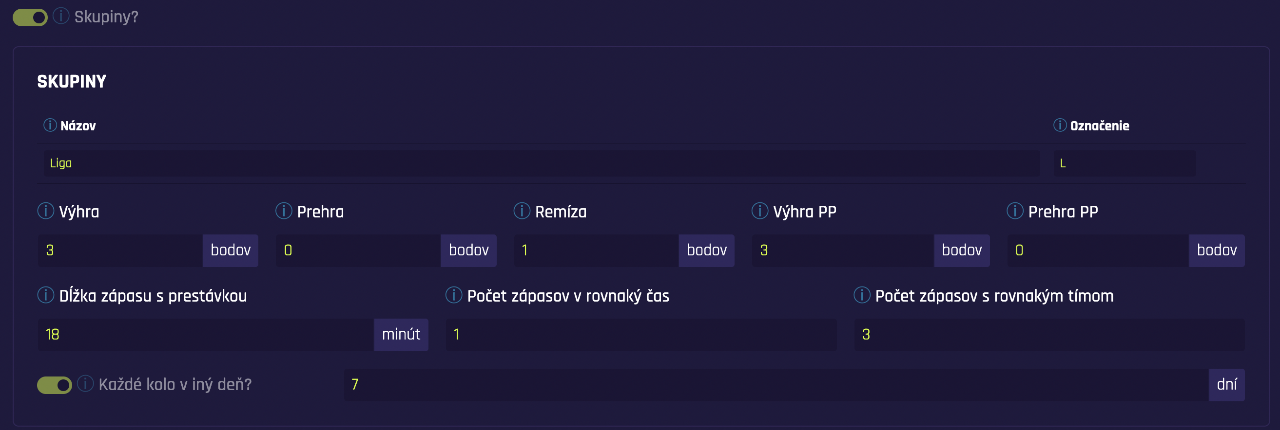 - Vytvorte si jednu skupinu. Všetky zaregistrované tímy v udalosti sa pripoja do skuiny ktorú ste vytvoril. Tým pádom vznikne round-robin (každý s každým)